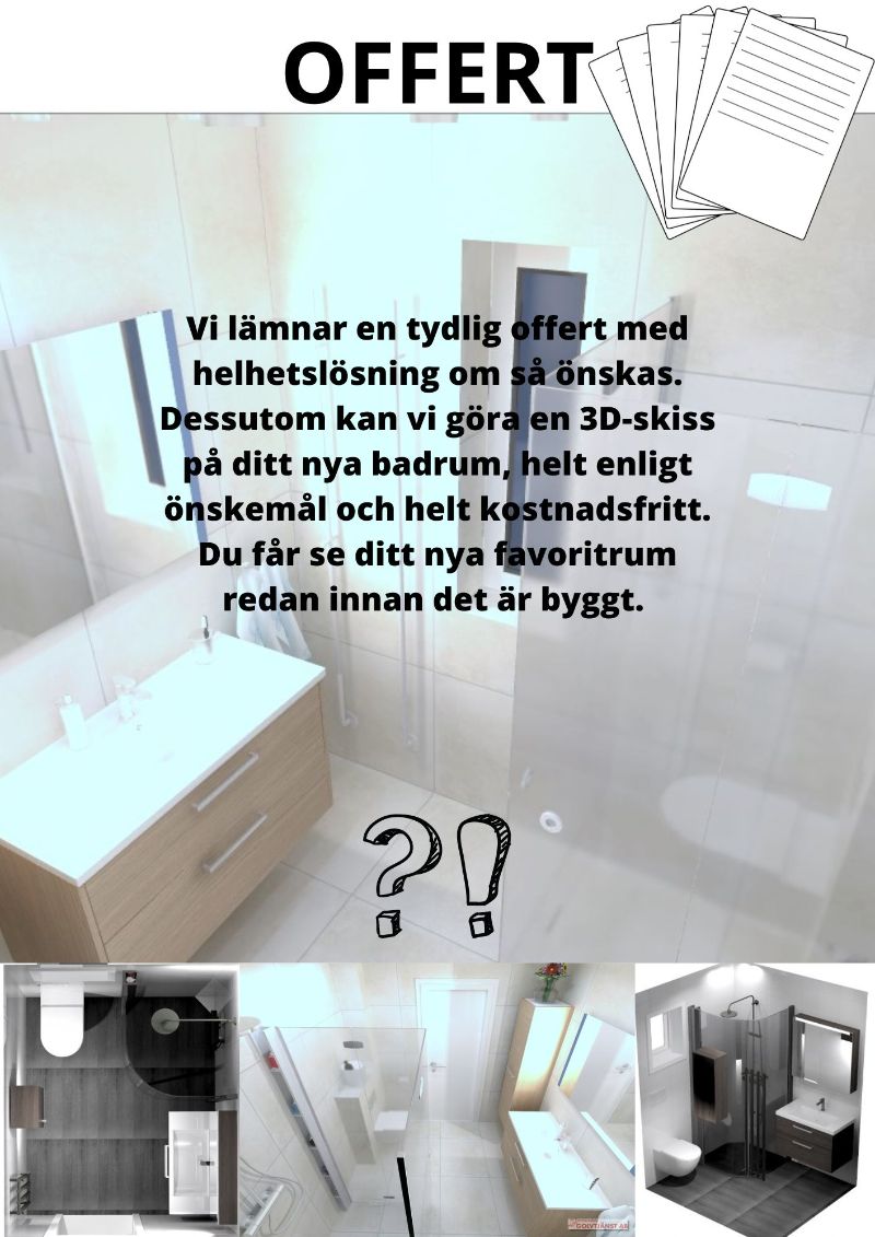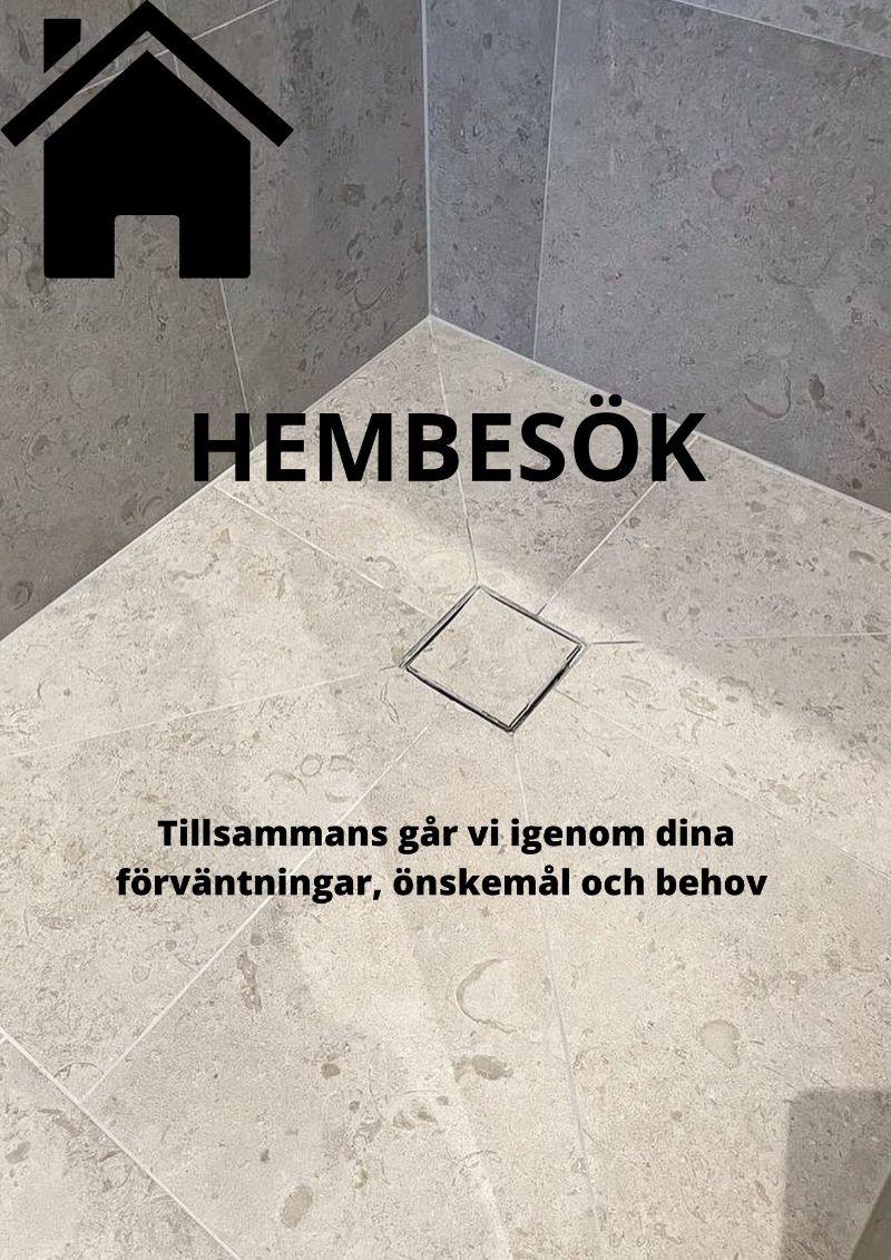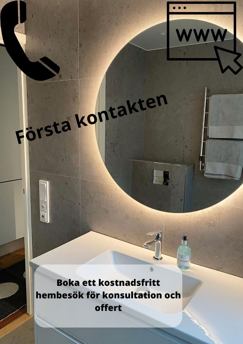 - En första kundkontakt där vi bokar ett kostnadsfritt hembesök för konsultation, kontroll av underlag, mätning och genomgång av vad ni önskar och vill med det nya badrummet.